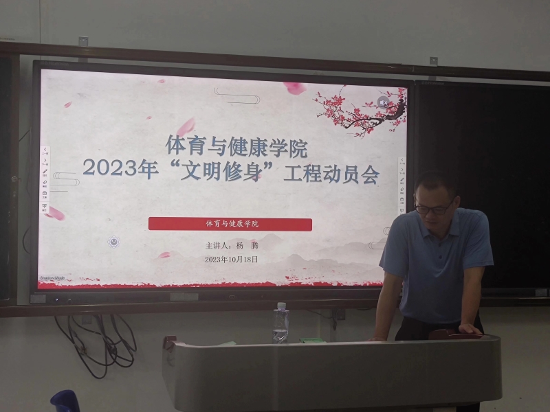 杨腾书记在“文明修身工程”动员会上主要讲了六个方面的内容。第一部分的主题为倡导仪表端庄,举止文明。他通过生动的案例讲解,让同学们认识到礼貌用语的重要性以及着装的规范等。